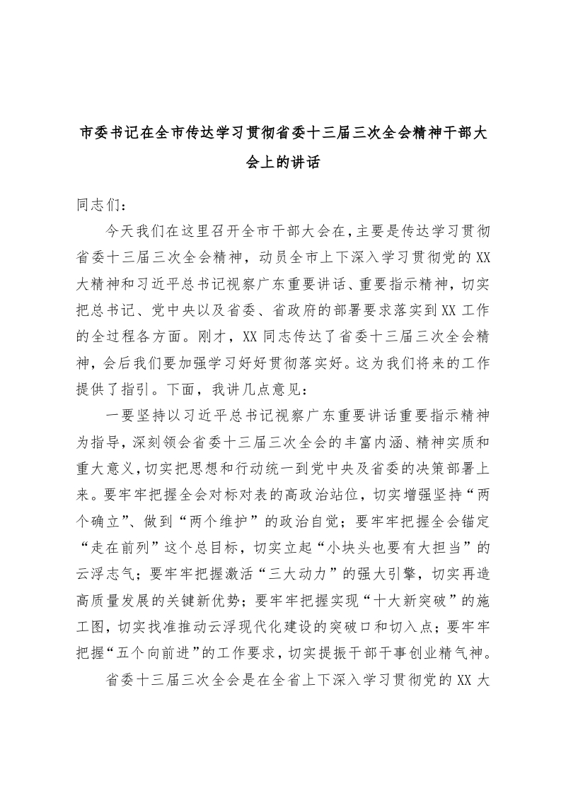 / 市委书记在全市传达学习贯彻省委十三届三次全会精神干部大会上的讲话