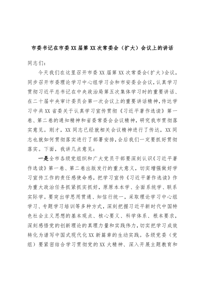 / 市委书记在市委XX届第XX次常委会(扩大)会议上的讲话