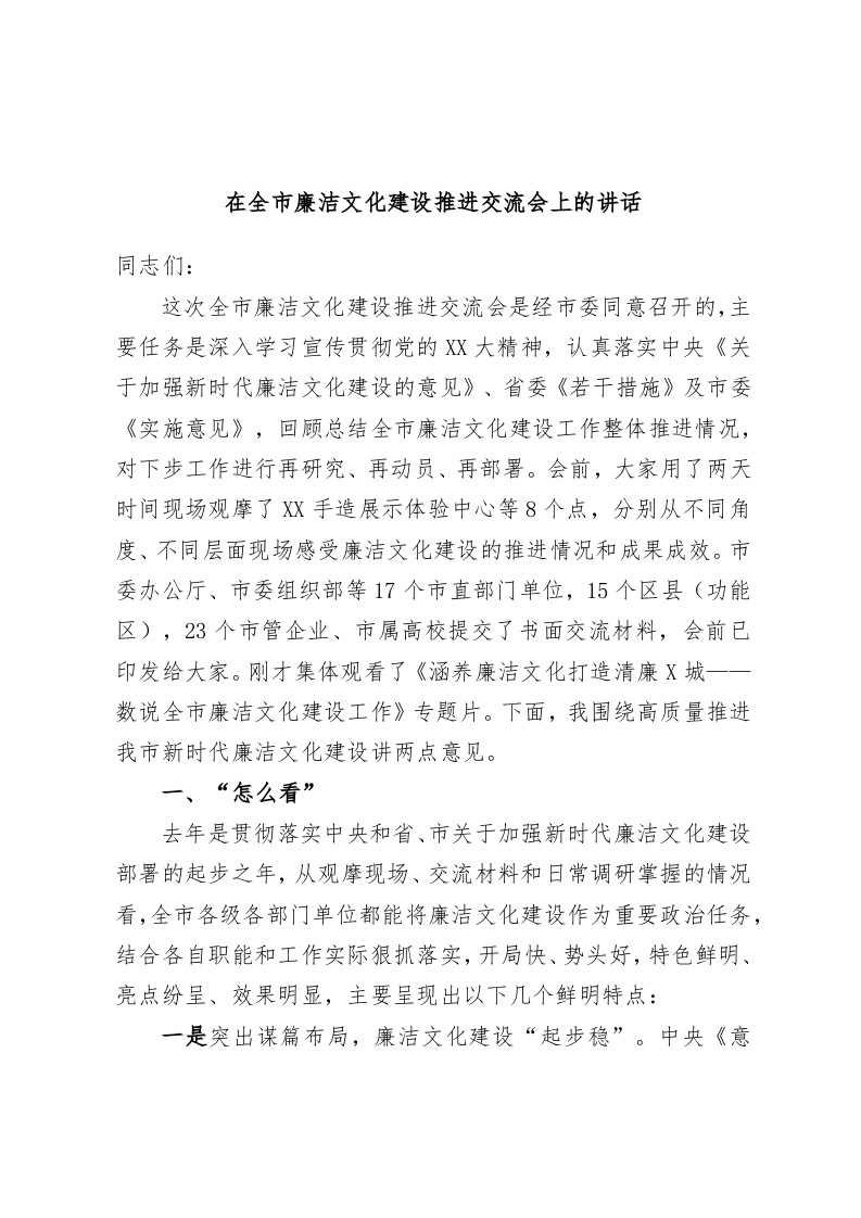 / 在全市廉洁文化建设推进交流会上的讲话