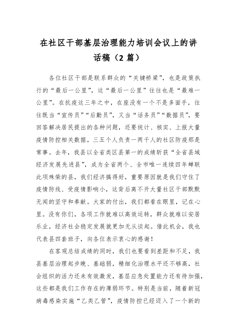 / (2篇)在社区干部基层治理能力培训会议上的讲话稿