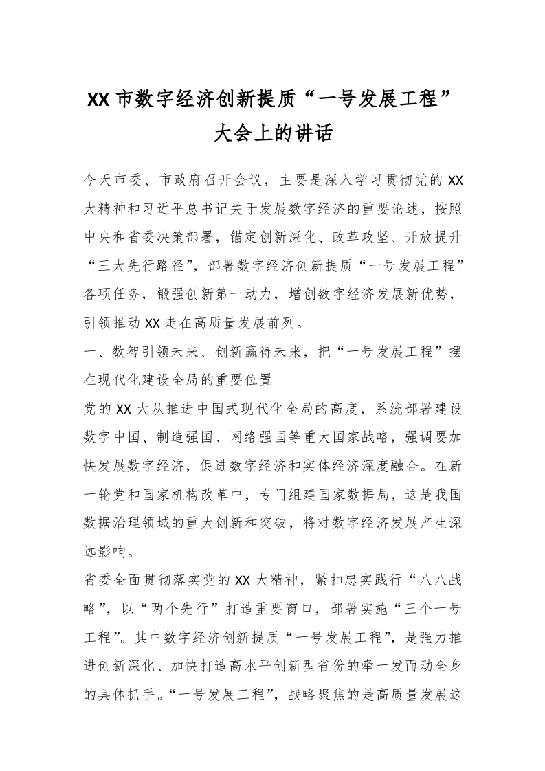 / XX市数字经济创新提质“一号发展工程”大会上的讲话