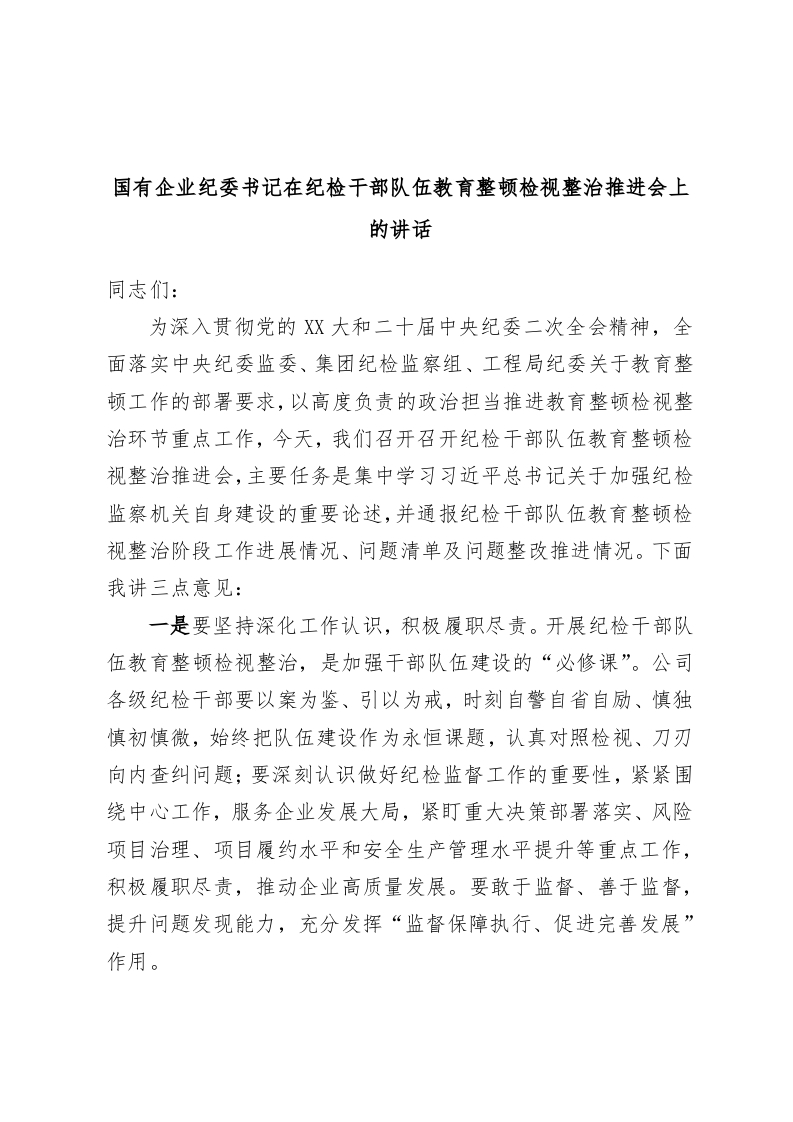 / 国有企业纪委书记在纪检干部队伍教育整顿检视整治推进会上的讲话