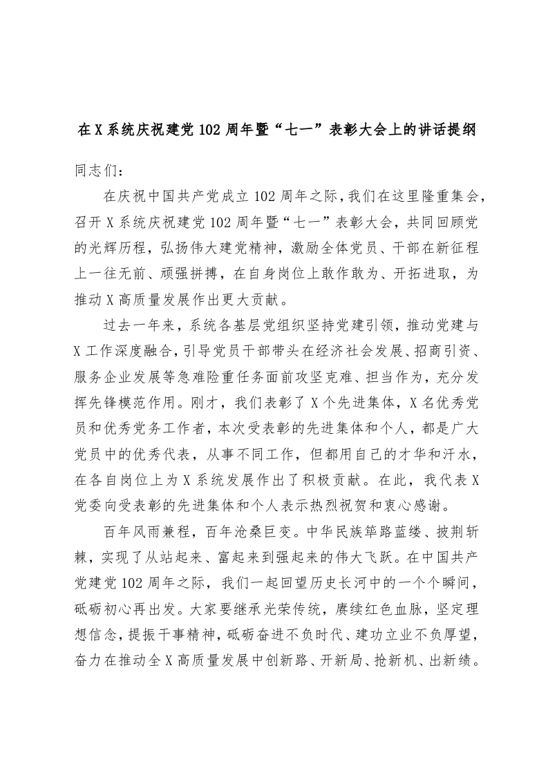 / 在X系统庆祝建党102周年暨“七一”表彰大会上的讲话提纲