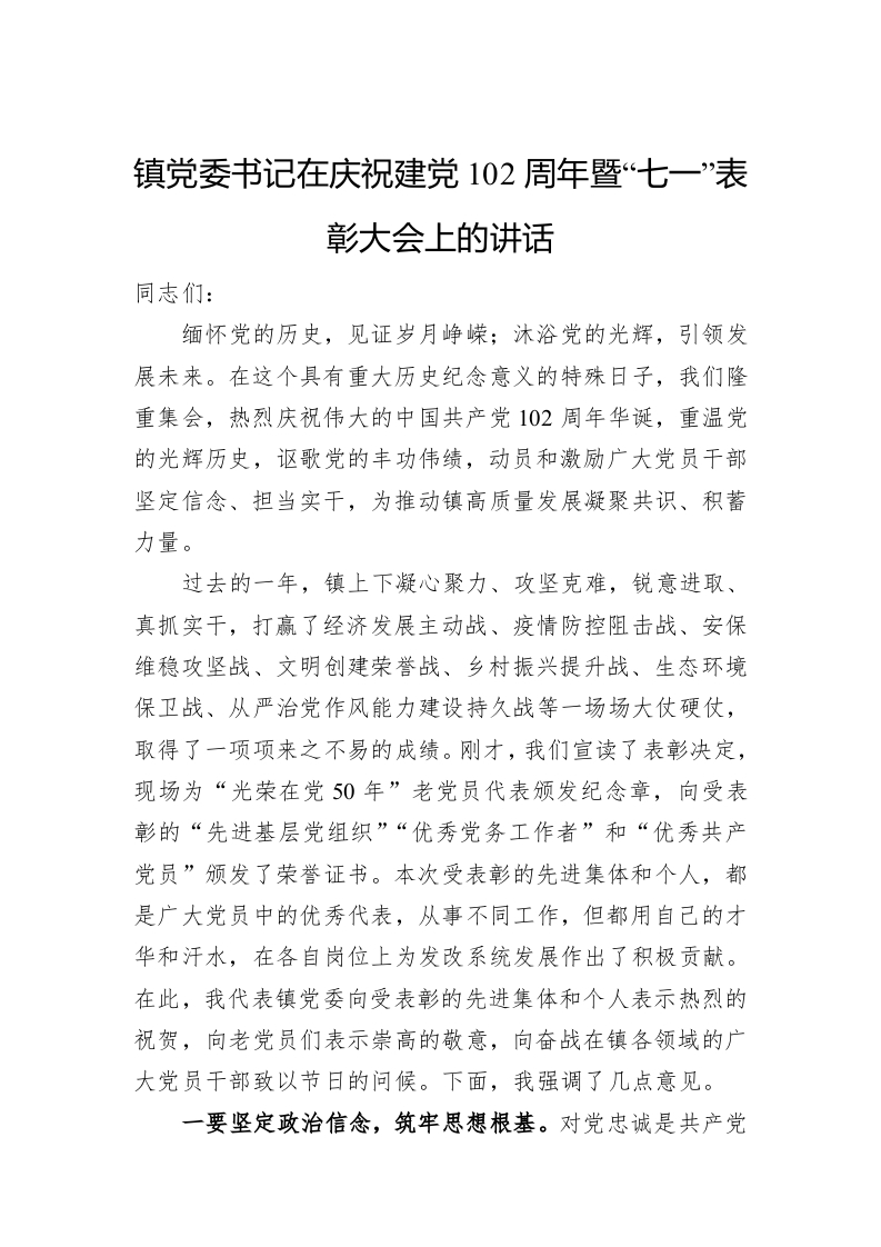 / 镇党委书记在庆祝建党102周年暨“七一”表彰大会上的讲话