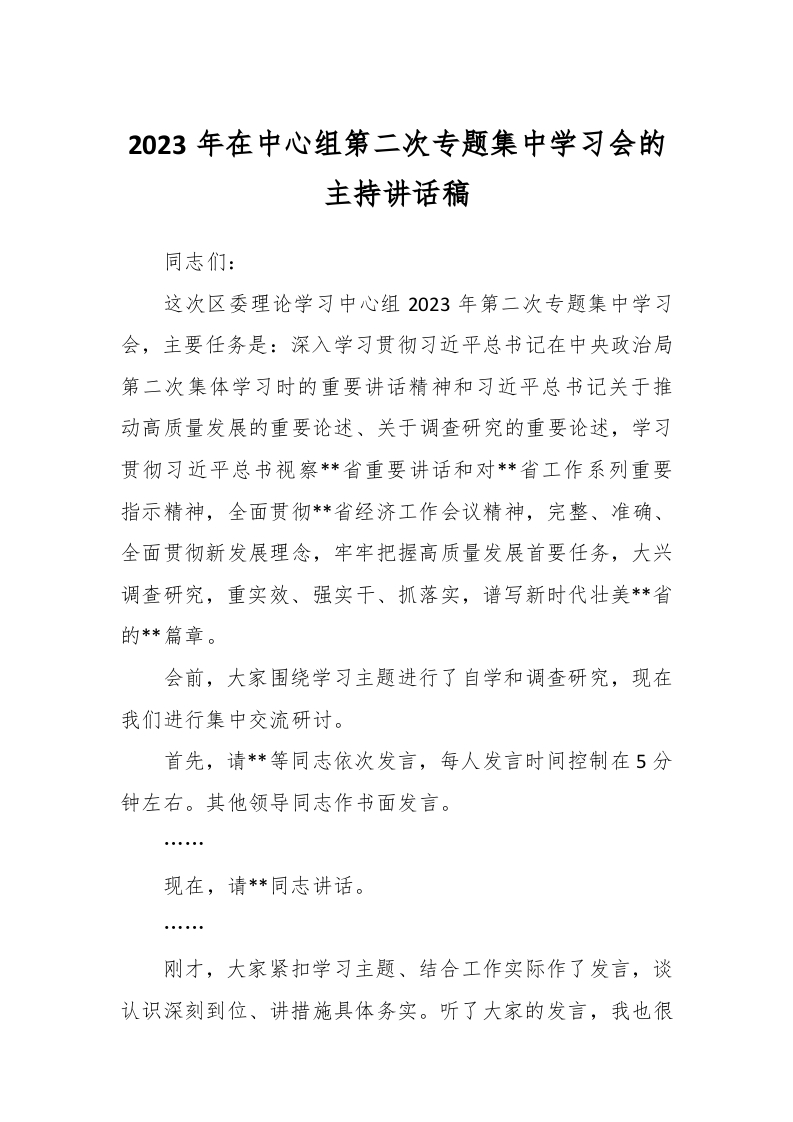 / 2023年在中心组第二次专题集中学习会的主持讲话稿