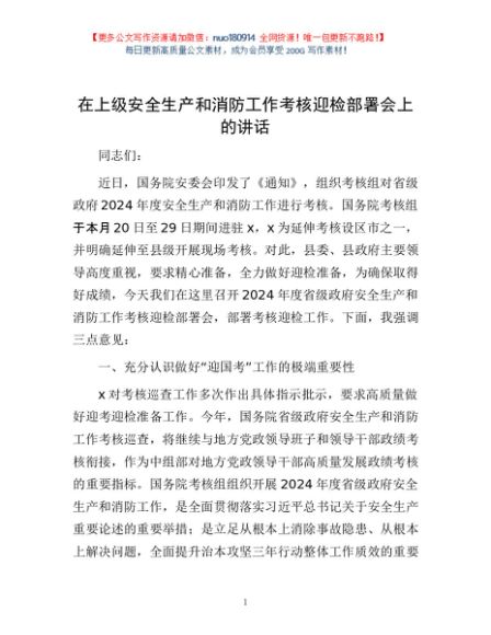/ 在上级安全生产和消防工作考核迎检部署会上的讲话