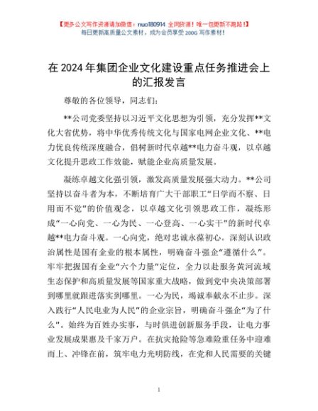 / 在2024年集团企业文化建设重点任务推进会上的汇报发言