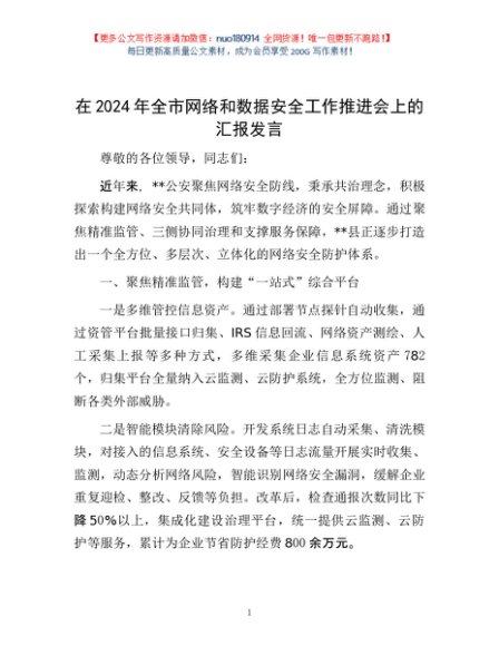 / 在2024年全市网络和数据安全工作推进会上的汇报发言