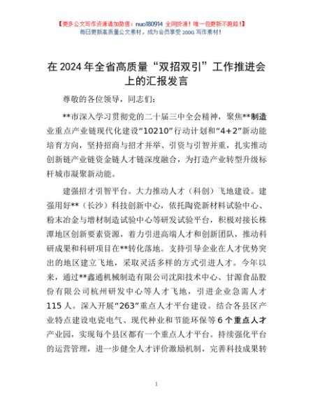 / 在2024年全省高质量“双招双引”工作推进会上的汇报发言