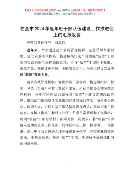 / 在全市2024年度年轻干部队伍建设工作推进会上的汇报发言