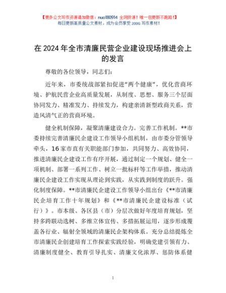 / 在2024年全市清廉民营企业建设现场推进会上的发言