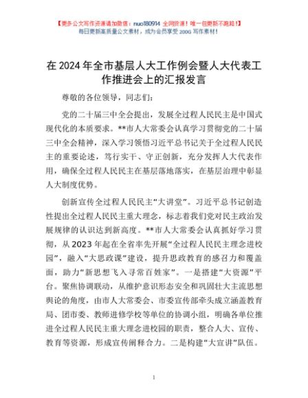 / 在2024年全市基层人大工作例会暨人大代表工作推进会上的汇报发言