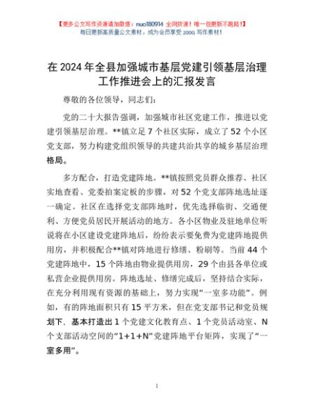 / 在2024年全县加强城市基层党建引领基层治理工作推进会上的汇报发言
