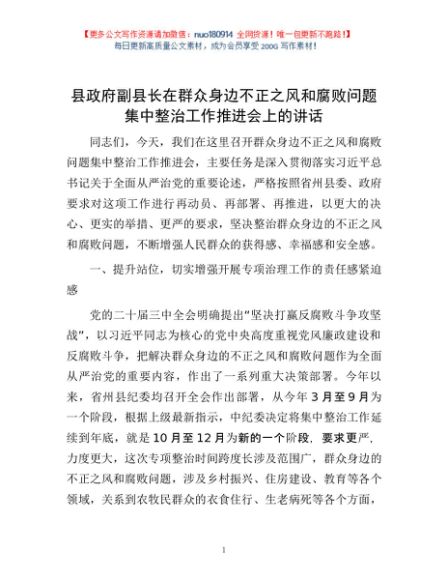/ 县政府副县长在群众身边不正之风和腐败问题集中整治工作推进会上的讲话
