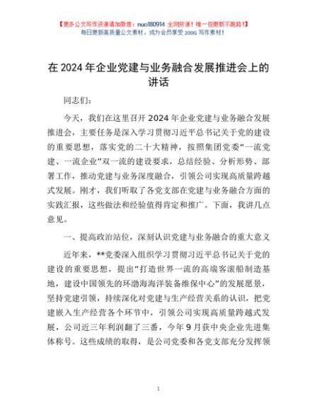 / 在2024年企业党建与业务融合发展推进会上的讲话