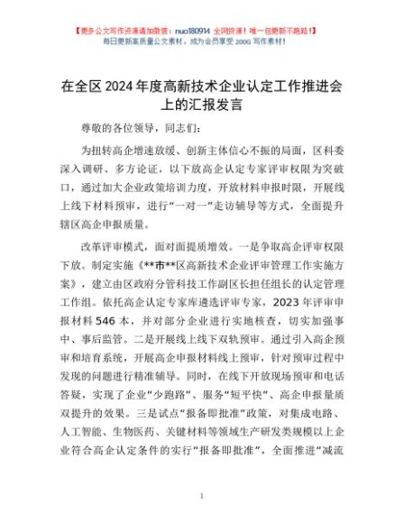 / 在全区2024年度高新技术企业认定工作推进会上的汇报发言