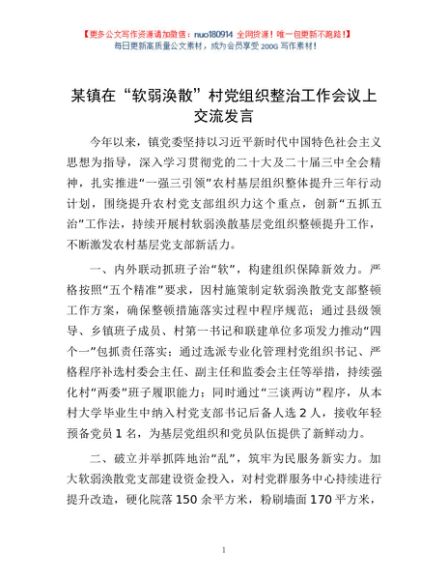 / 某镇在“软弱涣散”村党组织整治工作会议上交流发言