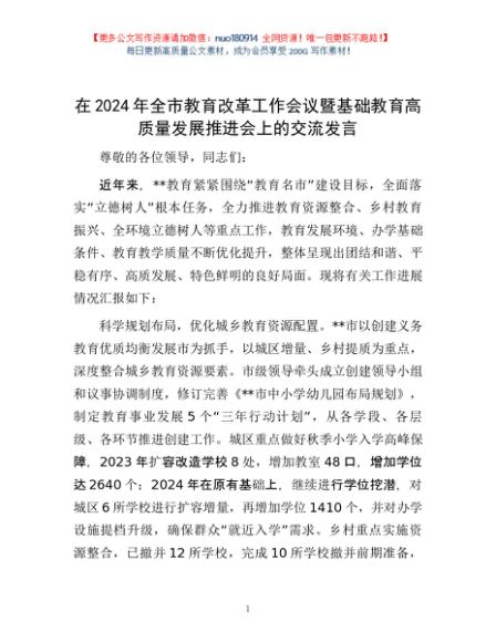 / 在2024年全市教育改革工作会议暨基础教育高质量发展推进会上的交流发言