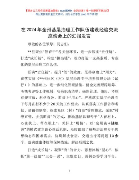 / 在2024年全州基层治理工作队伍建设经验交流座谈会上的汇报发言