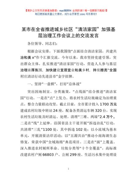 / 某市在全省推进城乡社区“清洁家园”加强基层治理工作会议上的交流发言