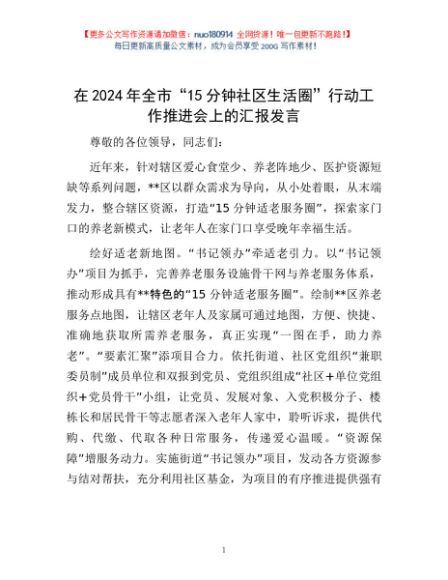 / 在2024年全市“15分钟社区生活圈”行动工作推进会上的汇报发言