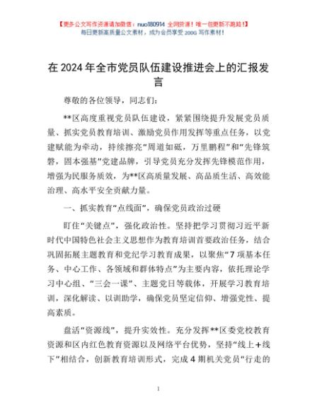 / 在2024年全市党员队伍建设推进会上的汇报发言
