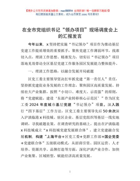 / 在全市党组织书记“领办项目”现场调度会上的汇报发言