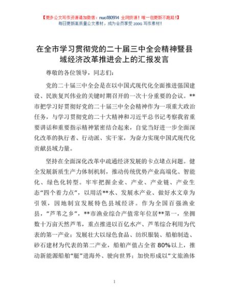 / 在全市学习贯彻党的二十届三中全会精神暨县域经济改革推进会上的汇报发言