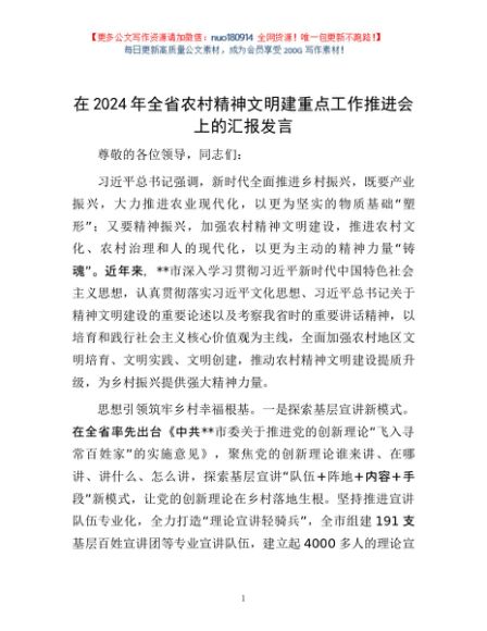 / 在2024年全省农村精神文明建重点工作推进会上的汇报发言
