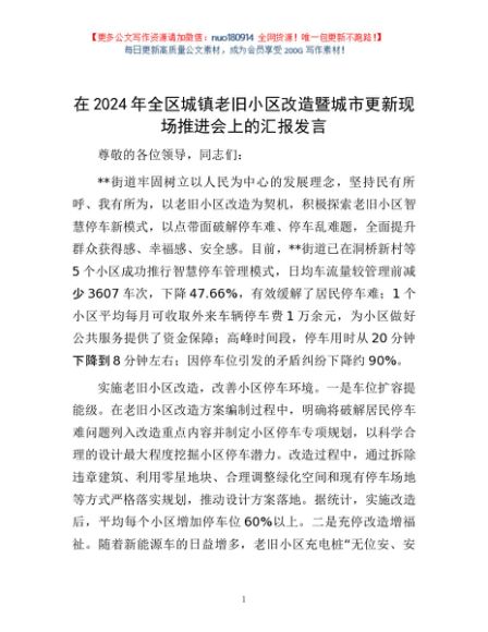 / 在2024年全区城镇老旧小区改造暨城市更新现场推进会上的汇报发言