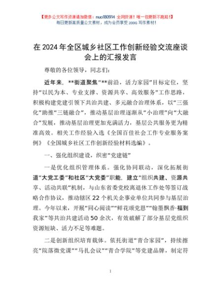 / 在2024年全区城乡社区工作创新经验交流座谈会上的汇报发言