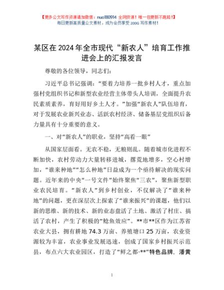/ 某区在2024年全市现代“新农人”培育工作推进会上的汇报发言