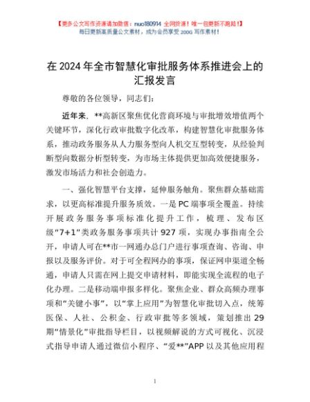 / 在2024年全市智慧化审批服务体系推进会上的汇报发言