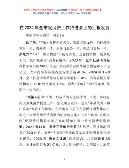 / 在2024年全市促消费工作推进会上的汇报发言