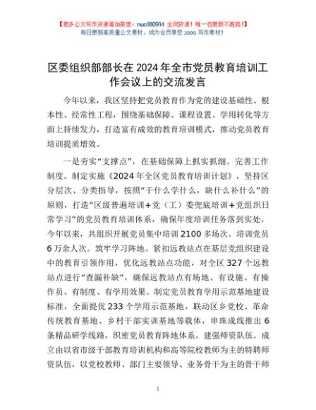 / 区委组织部部长在2024年全市党员教育培训工作会议上的交流发言