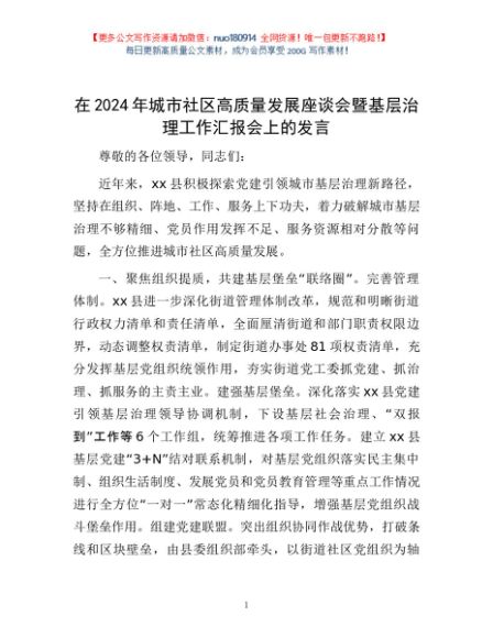 / 在2024年城市社区高质量发展座谈会暨基层治理工作汇报会上的发言
