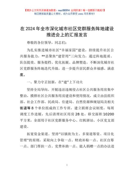 / 在2024年全市深化城市社区党群服务阵地建设推进会上的汇报发言