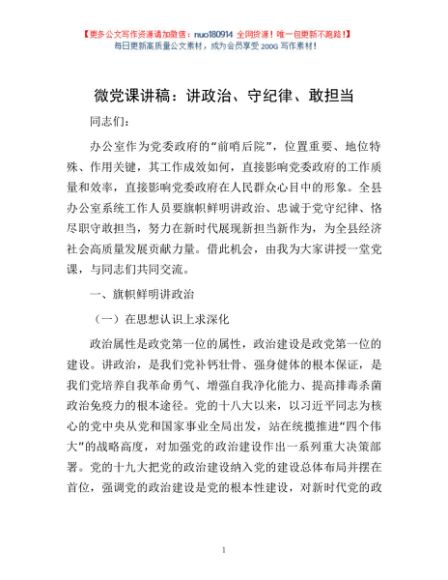 / 微党课讲稿:讲政治、守纪律、敢担当