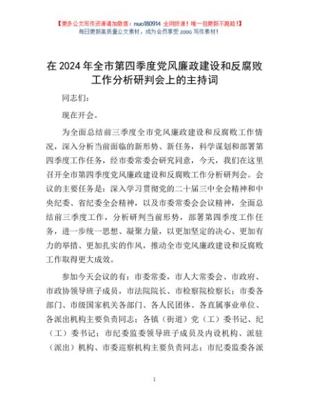 / 在2024年全市第四季度党风廉政建设和反腐败工作分析研判会上的主持词