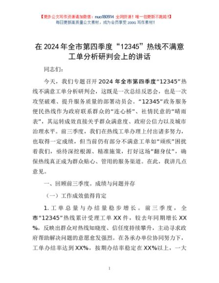 / 在2024年全市第四季度“12345”热线不满意工单分析研判会上的讲话
