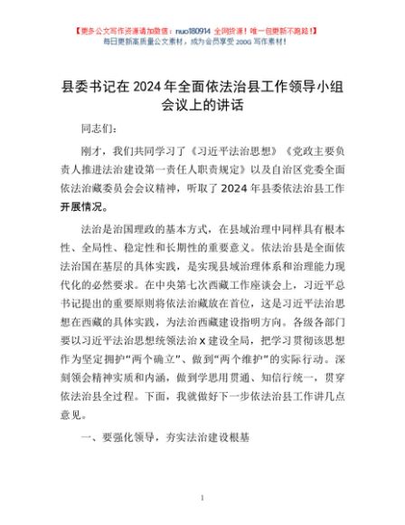/ 县委书记在2024年全面依法治县工作领导小组会议上的讲话
