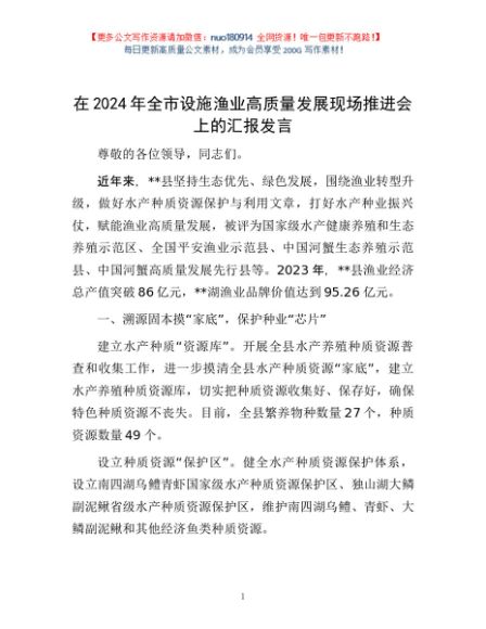 / 在2024年全市设施渔业高质量发展现场推进会上的汇报发言