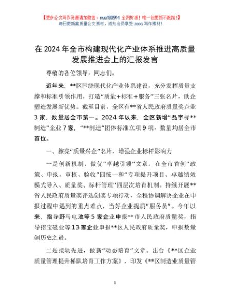 / 在2024年全市构建现代化产业体系推进高质量发展推进会上的汇报发言
