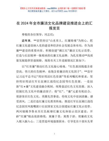 / 在2024年全市廉洁文化品牌建设推进会上的汇报发言