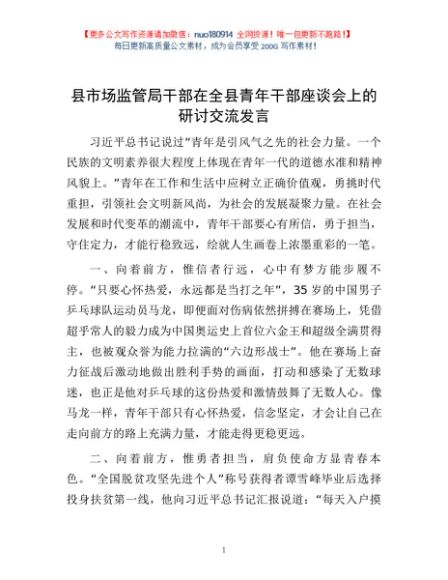 / 县市场监管局干部在全县青年干部座谈会上的研讨交流发言