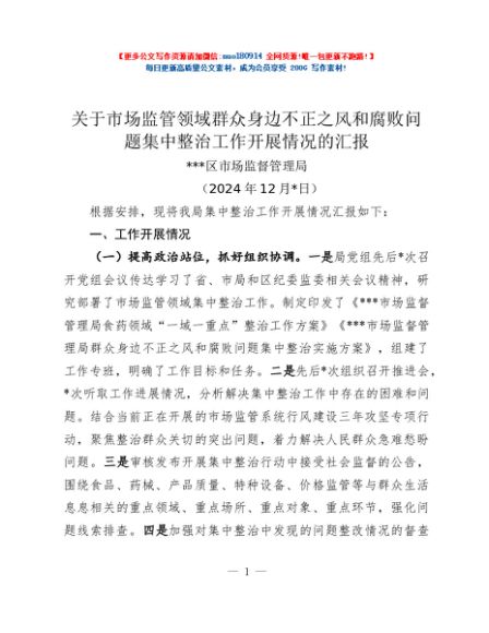 / 关于市场监管领域群众身边不正之风和腐败问题集中整治工作开展情况的汇报