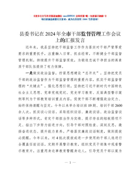 / 县委书记在2024年全市干部监督管理工作会议上的汇报发言