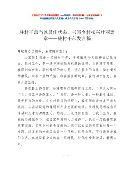 / 驻村干部当以最佳状态,书写乡村振兴壮丽篇章——驻村干部发言稿