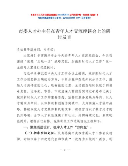 / 市委人才办主任在青年人才交流座谈会上的研讨发言