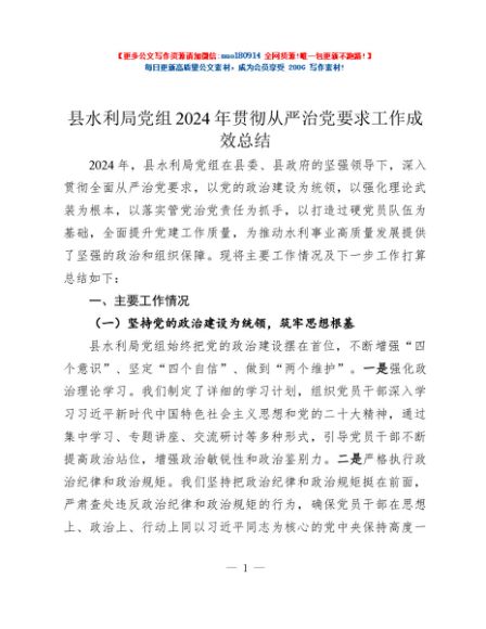 / 县水利局党组2024年贯彻从严治党要求工作成效总结